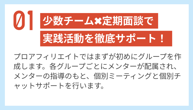 各グループごとにメンターが配属され、 メンターの指導のもと、個別ミーティングと個別チャットサポートを行います。
