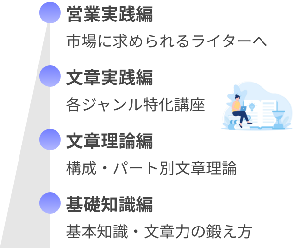 まずは「ライターの仕事はどういうものか?」から始まり、すべての文章に通じる文章理論、そしてジャンルに特化した専門的な技術を順番に学んでいきます。初心者でも迷うこと無く着実に身につけられるカリキュラムです! -