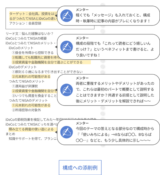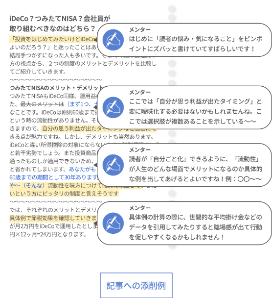 文章は闇雲に書いていても上達しません。アウトプットに対して丁寧にフィードバックをお返ししますので、着実なスキルアップへ繋がります。 -